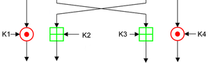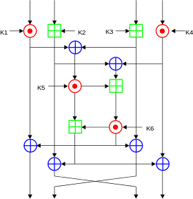 • 其中第 1 个和第 4 个解密子密钥为相应的子密钥关于 2^{16}+1 的乘法逆元。